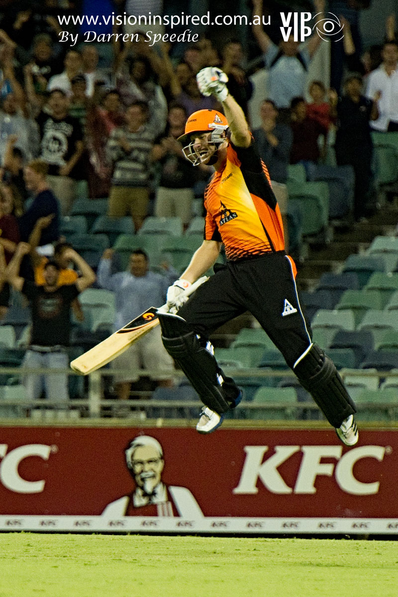 Mike Hussey celebrating a win for the Perth Scorchers in the Big Bash League.